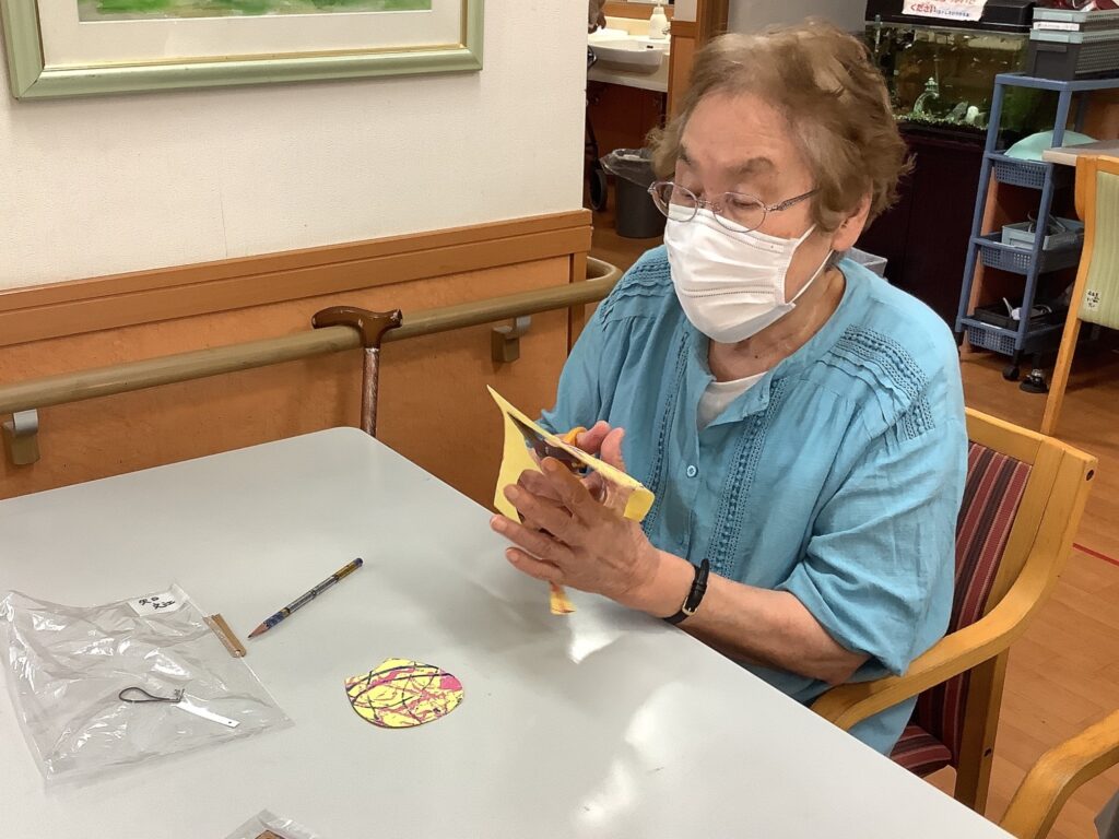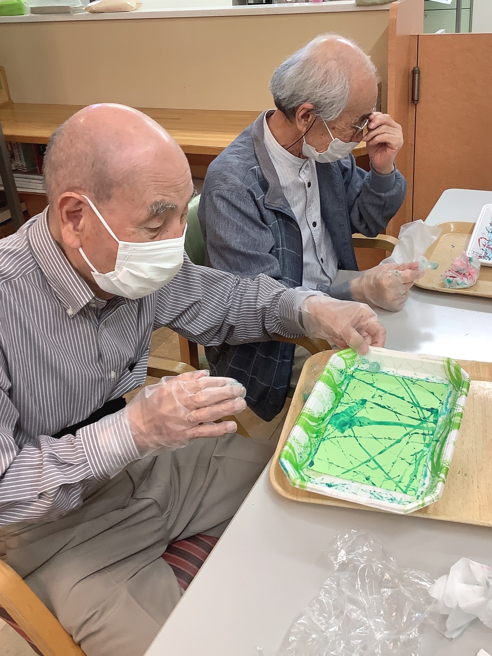 好きな色の画用紙を選んでいただき、ビー玉に色をのせコロコロと転がしながら色を付けました。